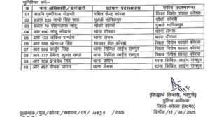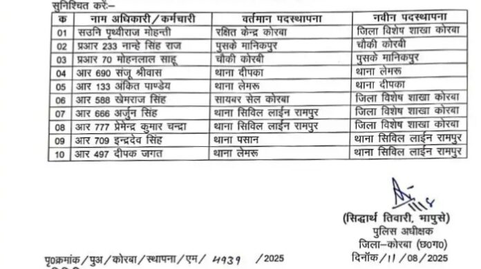 🔊 इस खबर को सुने Homechhathisgarh कोरबा पुलिस विभाग में 10 पुलिसकर्मियों का तबादला chhathisgarhकोरबा By News Desk August 11, 2025 Share FacebookXPinterestWhatsAppTelegram छत्तीसगढ़िया क्रान्ति सेना ने एस ई सी एल मुख्यालय में किया प्रदर्शन April 28, 2026 सुशासन तिहार अवधि में शासकीय अधिकारियों-कर्मचारियों के अवकाश पर प्रतिबंध April 28, 2026 जंगल की आग जैसा लाल … पर जंगलवासियों की जिंदगी में उजियारा भरने वाला- पलाश का फूल April 28, 2026 श्रमिकों के अधिकारों की सुरक्षा और सशक्तिकरण पर सरकार का फोकस, “ई-श्रम साथी” एप लॉन्च April 28, 2026 माध्यमिक शिक्षा बोर्ड द्वारा हाई स्कूल और हायर सेकंडरी परीक्षाओं के परिणाम कल इस लिंक से देखें परिणाम April 28, 2026 - Advertisement -🔊 इस खबर को सुने कोरबा@M4S:कोरबा जिला पुलिस अधीक्षक सिद्धार्थ तिवारी ने एक ASI पृथ्वीराज मोहंती, दो प्रधान आरक्षकों सहित कुल 10 पुलिस कर्मियों की पदस्थापना में फेरबदल किया है।देखें पूरी सूची: Tags10 policemen transferred in Korba Police Department Share FacebookXPinterestWhatsAppTelegram 🔊 इस खबर को सुने Previous articleINDEPENDENCE DAY 2025: सिर्फ भारत ही नहीं, 15 अगस्त के दिन ही ये 4 देश भी हुए थे आजादNext articleDHAMTARI TRIPLE MURDER: दौड़ा-दौड़ाकर दो भाई समेत तीन युवकों का कत्ल, आरोपियों को भेजा गया जेल छत्तीसगढ़िया क्रान्ति सेना ने एस ई सी एल मुख्यालय में किया प्रदर्शन सुशासन तिहार अवधि में शासकीय अधिकारियों-कर्मचारियों के अवकाश पर प्रतिबंध जंगल की आग जैसा लाल … पर जंगलवासियों की जिंदगी में उजियारा भरने वाला- पलाश का फूल श्रमिकों के अधिकारों की सुरक्षा और सशक्तिकरण पर सरकार का फोकस, “ई-श्रम साथी” एप लॉन्च Load more Related Articles News Desk - April 28, 2026छत्तीसगढ़िया क्रान्ति सेना ने एस ई सी एल मुख्यालय में किया प्रदर्शन News Desk - April 28, 2026सुशासन तिहार अवधि में शासकीय अधिकारियों-कर्मचारियों के अवकाश पर प्रतिबंध News Desk - April 28, 2026जंगल की आग जैसा लाल … पर जंगलवासियों की जिंदगी में उजियारा भरने वाला- पलाश का फूल Load more