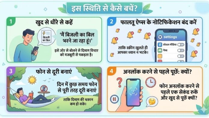 जैसे ही आप स्क्रीन अनलॉक करते हैं, ढेरों रंग-बिरंगे ऐप्स और नोटिफिकेशन आपके दिमाग पर हमला कर देते हैं। इस कॉग्निटिव ओवरलोड के कारण दिमाग की सीमित क्षमता वाली वर्किंग मेमोरी से पुरानी बात डिलीट हो जाती है और नए खयाल उसकी जगह ले लेते हैं।