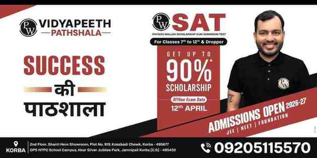 कोरबा@M4S,: शहर के विद्यार्थियों के लिए एक बड़ा शैक्षणिक अवसर सामने आया है। *Physics Wallah Vidyapeeth Pathshala, Korba* द्वारा आगामी *12 अप्रैल* को *Mega Offline Scholarship Test (SAT)* आयोजित किया जा रहा है, जिसके माध्यम से छात्रों को *90% तक स्कॉलरशिप* प्राप्त करने का सुनहरा मौका मिलेगा। यह परीक्षा विशेष रूप से कक्षा 8वीं से 12वीं तक के विद्यार्थियों तथा JEE/NEET की तैयारी कर रहे छात्रों के लिए रखी गई है, ताकि उन्हें कम शुल्क में बेहतर गुणवत्ता वाली ऑफलाइन कोचिंग उपलब्ध कराई जा सके।