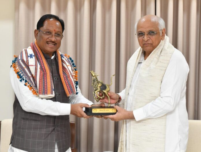 रायपुर@M4S:मुख्यमंत्री विष्णु देव साय ने आज गांधीनगर स्थित मुख्यमंत्री आवास में गुजरात के मुख्यमंत्री भूपेंद्र पटेल से सौजन्य भेंट की। इस अवसर पर दोनों मुख्यमंत्रियों ने परस्पर सहयोग एवं विकास के अनुभव साझा किए।