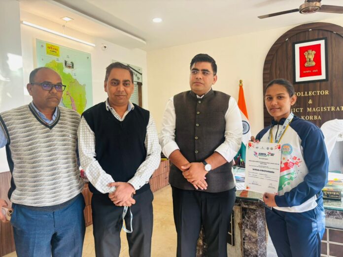 कोरबा@M4S: भारत सरकार के युवा मामले और खेल मंत्रालय और भारतीय खेल प्राधिकरण (SAI) के मार्गदर्शन में खेल एवं खिलाड़ीयो के विकास हेतु खेलो इंडिया कार्यक्रम के अंतर्गत अस्मिता खेलो इंडिया वेस्ट जोन किकबॉक्सिंग प्रतियोगिता का आयोजन 25 से 29 दिसंबर 2025 तक इंदौर में किया गया।जिसमें वेस्ट जोन से मध्य प्रदेश, तेलंगाना, दमन दियू, गुजारात, राजस्थान, महाराष्ट्र, गोवा सहित छत्तीसगढ़ ने भाग लिया। जिसमें कोरबा जिले के सी एम ए किकबॉक्सिंग एकेडमी से हर्षिता यादव ने स्वर्ण पदक एवं लोकिता चौहान, नाफिया सिद्दीकी, श्रेया लक्ष्मी साहू, कर्रा तेजस्विनी ने कांस्य पदक जीता।