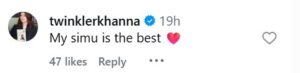 इस पोस्ट में सिमर भाटिया ने फिल्म इक्कीस में काम करने के अपने अनुभव को साझा किया है। सिमर की इस पोस्ट पर उनकी मामी ट्विंकल खन्ना का स्पेशल कमेंट आया है, जिस पर उन्होंने लिखा है- ”मेरी सिम्मू सबसे बेस्ट है।” इस तरह से ट्विंकल ने सिमर भाटिया पर जमकर प्यार लुटाया है। अपनी मामी के कमेंट का रिप्लाई देते हुए सिमर ने भी लिखा है- लव यू, नया 2026 मुबारक हो।