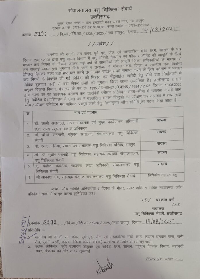 कोरबा@M4S:छत्तीसगढ़ के वरिष्ठ आदिवासी नेता पूर्व गृह मंत्री ननकी राम कंवर ने शराब घोटाला के तर्ज पर पशु औषधि घोटाला खरीदी में बड़ा भ्रष्टाचार उजागर करने के संबंध में पत्र लिखा है शिकायत पत्र पर संचालक पशु चिकित्सा विभाग ने संज्ञान लेते हुए जांच टीम गठित कर दिया है जांच टीम को एक सप्ताह के अंदर जांच रिपोर्ट प्रस्तुत करने के लिए निर्देश जारी किया गया है छत्तीसगढ़ प्रदेश मे पूर्ववर्ती कांग्रेस शासन काल से लेकर आज तक पशु चिकित्सा विभाग में राज्य व जिला स्तर पर पशुओं के उपचार मे उपयोग में आने वाले पशु औषधि की खरीदी के लिए सभी जिला के उपसंचालकों पशु चिकित्सा विभाग के माध्यम से पशु औषधि वैक्सीन, फिट सप्लीमेंट्री इत्यादि की खरीदी भंडार क्रय नियम के विपरीत किया गया है जिसमें 10% पशु औषधि की खरीदी होती है लेकिन फर्जी तरीके से 100% दवाई खरीदी का फर्जी भुगतान संबंधित डीलर को सांठ गांठ कर किया जाता है दवाई की खरीदी डीलरों के द्वारा नियम विरुद्ध तरीके से खरीदी किया जाता है कोई भी कार्यालय दवाई निर्माता कंपनी से दवा सप्लीमेंट्री खरीदी नहीं की जाती जिसमें अरबो रुपए का पशु औषधि खरीदी में घोटाला सामने आने की संभावना दिख रही है। ननकी राम कंवर ने मांग किया है कि पशु औषधि संबंधित निर्माता कंपनी से निविदा के आधार पर खरीदी की जाए जिससे भ्रष्टाचार पर लगाम लगाया जा सकता है और सत दवाई की खरीदी हो सके पशु औषधि के नाम से फर्जी बिल के आधार पर जिन दवाई डीलरों और संबंधित जिला व राज्य के अधिकारी कर्मचारी सहित समझ दोषियों के विरुद्ध कड़ी कार्रवाई करने की मांग की है।