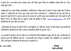 ऑफिशियल नोटिफिकेशन के दी गई डिटेल के मुताबिक “उम्मीदवारों का आधार लिंक्ड बायोमेट्रिक ऑथेंटिकेशन परीक्षा हॉल में प्रवेश से पहले परीक्षा केंद्र में किया जायेगा । उम्मीदवारों को अपना मूल आधार कार्ड लाना आवश्यक है । उम्मीदवारों को एक बार फिर से सलाह दी जाती है की वे आधार सत्यापन के माध्यम से अपनी पहचान को प्रमाणित करें, यदि पहले से नहीं किया गया है, तो परीक्षा केंद्र पर सुचारू प्रवेश की सुविधा के लिये www.rrbapply.gov.in पर अपने क्रेडेंशियल्स के साथ लॉग इन करके।” भर्ती से जुड़ी लेटेस्ट अपडेट के लिए अभ्यर्थियों को समय समय पर ऑफिशियल वेबसाइट पर विजिट करने की सलाह दी जाती है।