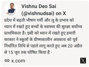 बढ़ती भीषण गर्मी में बच्चों की सेहत की सुरक्षा हर हाल में सुनिश्चित करना हमारी जिम्मेदारी है:मुख्यमंत्री विष्णु देव साय