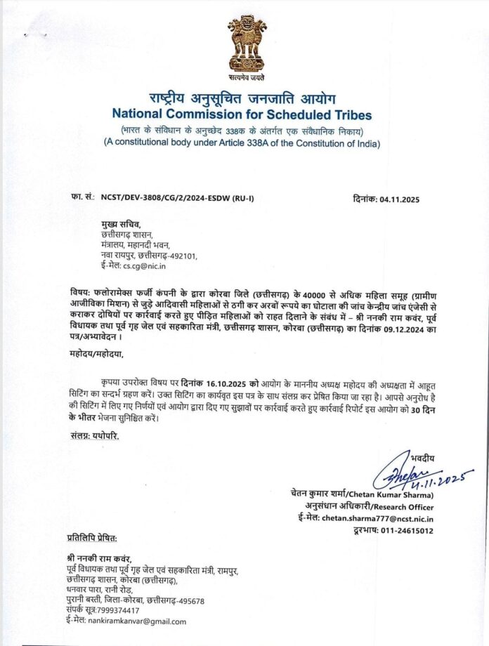 कोरबा@M4S:भाजपा के वरिष्ठ आदिवासी नेता पूर्व गृहमंत्री ननकी राम कंवर ने कोरबा जिले के 40000 से अधिक महिलाओं के साथ में फ्लोरमैक्स कंपनी के नाम पर अरबो रुपए घोटाला की शिकायत की जांच हेतु केंद्रीय अनुसूचित जनजाति आयोग को 09/12/2024 को किया गया था। ननकी राम कंवर ने आयोग से मांग किया था कि शिकायत की जांच केंद्रीय जांच एजेंसी से जांच कर कर दोषियों पर कड़ी कार्रवाई करते हुए पीड़ित महिलाओं को राहत प्रदान किया जाए। आयोग ने ननकी राम कंवर के शिकायत को गंभीरता से लेते हुए मुख्य सचिव छत्तीसगढ़ शासन को नोटिस जारी कर रिपोर्ट मंगाया गया था। आयोग को प्राप्त रिपोर्ट के आधार पर मुख्य सचिव छत्तीसगढ़ शासन को आयोग के समक्ष सुनवाई हेतु 16/10/2025 तिथि निर्धारित किया गया था। मुख्य सचिव की ओर से सुनील कुमार जैन संभाग आयुक्त बिलासपुर आयोग के समक्ष उपस्थित होकर पक्ष रखा। संभाग आयुक्त ने बताया कि फ्लोरामैक्स मामले में अखिलेश सिंह नामक व्यक्ति द्वारा बनाई गई धोखाधड़ी वाली कंपनी से जुड़े 13 लोगों की गिरफ्तार किया गया जिनमें तीन को छोड़कर बाकी सभी 10 लोगो का जमानत हो चुका है। जांच अधिकारी पीड़ितों को मुआवजा देने के लिए आरोपियों की सभी संपत्तियों की तलाश कर रहे हैं और कुछ संपत्ति बरामद भी हो गई है आयुक्त ने आश्वासन दिया कि मामले का शीघ्र निष्पक्ष और पारदर्शी ढंग से समाधान किया जाएगा। आयोग ने सुनवाई के बाद मुख्य सचिव छत्तीसगढ़ शासन को पत्र लिखकर सिफारिश किया है कि मामला गंभीर वित्तीय अनियमित और अनुसूचित जनजाति समुदाय की महिलाओं के आर्थिक शोषण से जुड़ा है इसलिए प्रथम सूचना रिपोर्ट और न्यायालय में प्रस्तुत चलन में अनुसूचित जाति और अनुसूचित जनजाति अत्याचार निवारण अधिनियम के तहत अपराध दर्ज कर मामले को समय बाद तरीके से सुलझा जा सकता है। संभाग आयुक्त ने अध्यक्ष अनुसूचित जनजाति आयोग को आश्वासन दिया कि मामले का शीघ्र, निष्पक्ष और पारदर्शी ढंग से समाधान किया जाएगा।