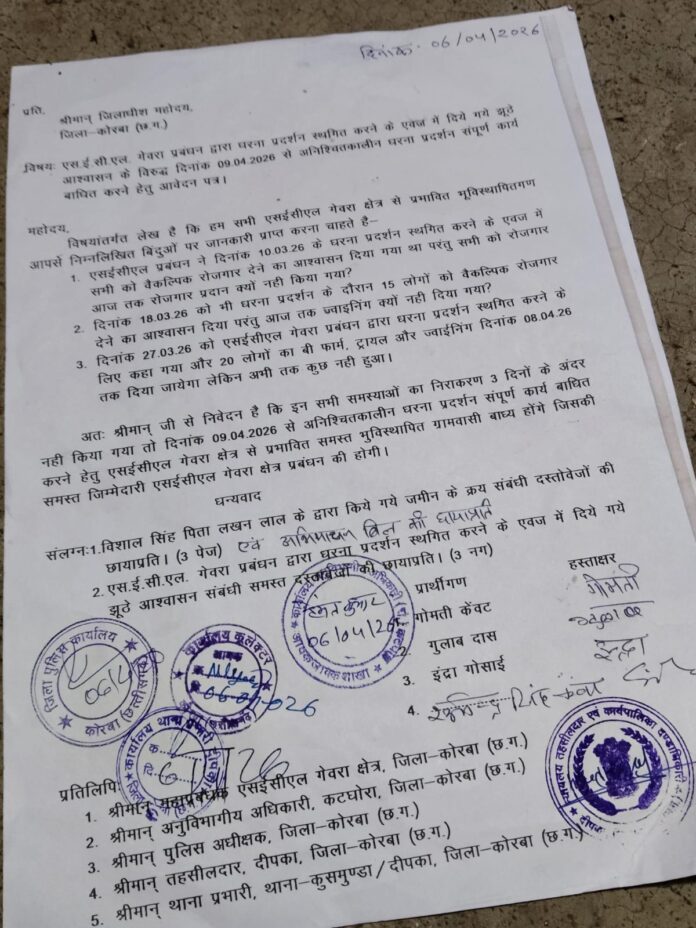 कोरबा@M4S:एसईसीएल (SECL) गेवरा क्षेत्र के भू-विस्थापितों ने प्रबंधन पर झूठे आश्वासन देने और रोजगार के वादे से मुकरने का गंभीर आरोप लगाया है बार-बार मिल रहे धोखे से आक्रोशित ग्रामीणों ने अब आर-पार की लड़ाई का ऐलान कर दिया है यदि आगामी तीन दिनों के भीतर समस्याओं का निराकरण नहीं हुआ तो 9 अप्रैल 2026 से एसईसीएल गेवरा क्षेत्र का संपूर्ण कार्य अनिश्चितकाल के लिए ठप कर दिया जाएगा ।