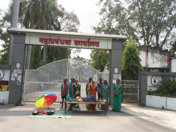 जीएम कार्यालय के सामने खाट पर लेटकर प्रदर्शन कुसमुंडा प्रबंधन के खिलाफ महिलाओं ने फिर खोला मोर्चा